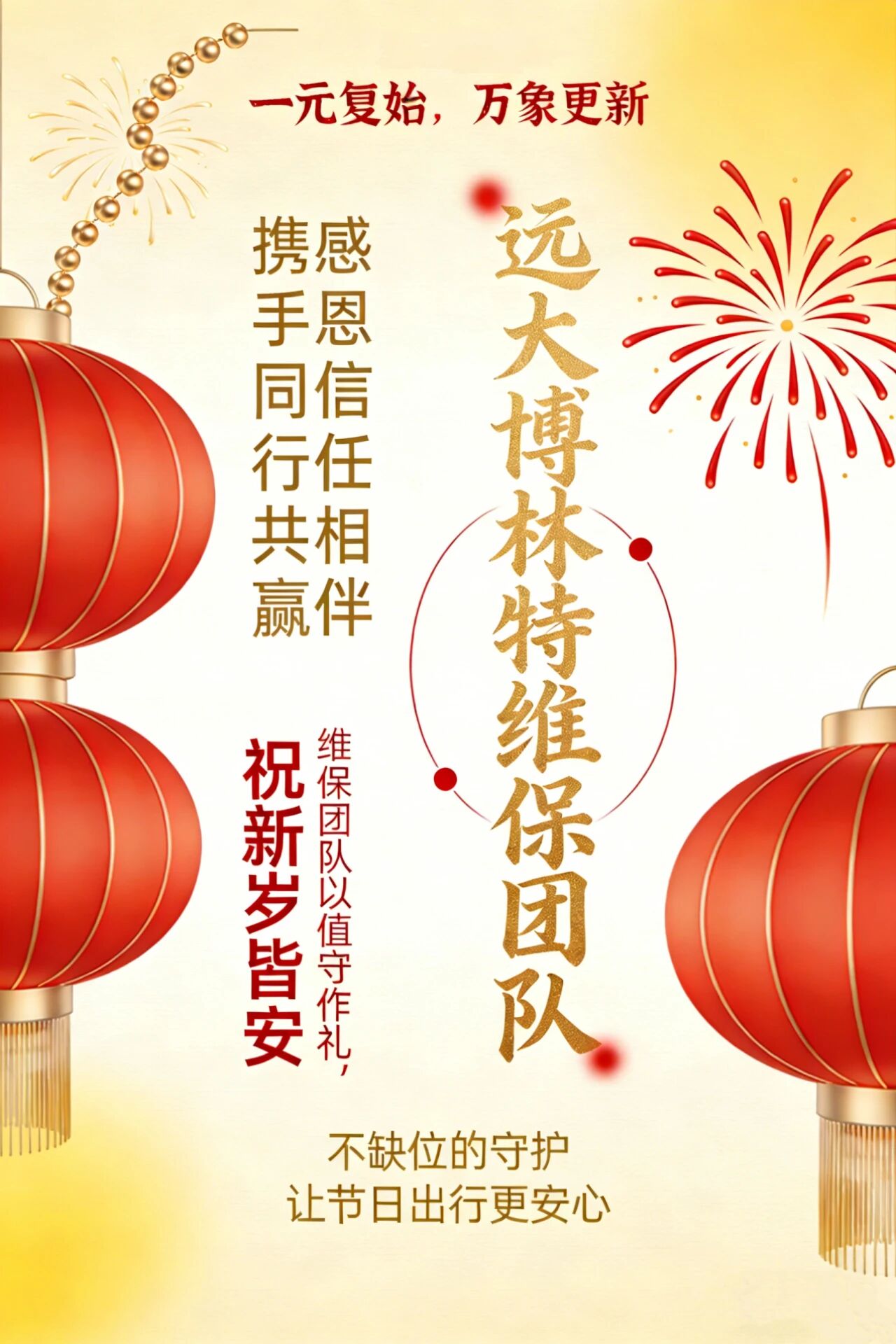 一元复始,万象更新,过往岁月里,感恩每一份信任相伴、每一次携手同行,你们的认可与支持,是我们笃定前行的不竭动力。远大智能博林特电梯维保团队以值守作礼,祝客户、伙伴新岁皆安——我们用“不缺位的守护”,让节日出行更安心。