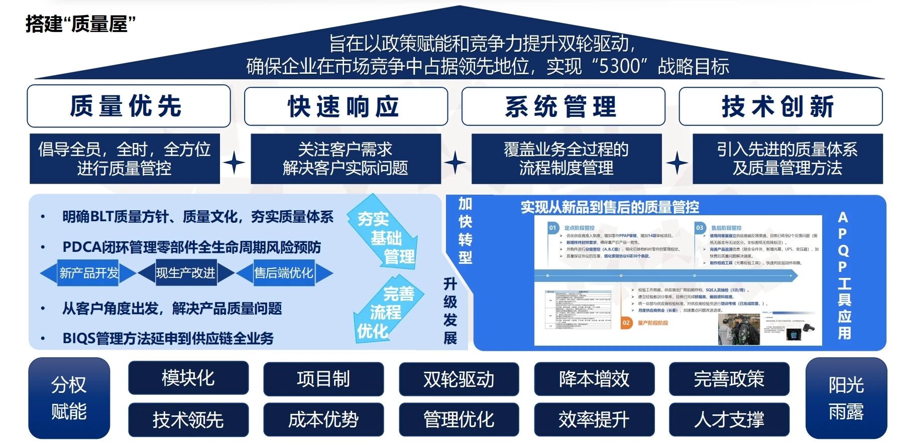 过去一年中,质量部完成了深刻的角色转型:以政策赋能和竞争力提升为双轮驱动,从传统的“质量把关者”进阶为“体系赋能者”。我们坚决打破“头痛医头”的传统模式,将质量触角向前延伸至产品设计与供应商管理,向后拓展至售后服务优化。