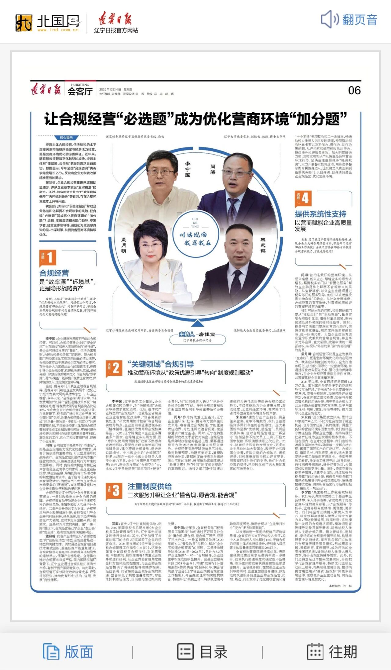 孟月明:我省产业结构正从“资源依附型”向“创新驱动型”转型,合规经营是这一转型的关键支撑。例如通过合规管理促进技术集成创新,避免低端产能重复建设。合规管控也可避免因环保或税务违规引发的连锁反应,保障产业链稳定。全球供应链对合规要求日益严格,国内国际双循环背景下,辽宁企业通过合规认证拓展海外市场,有利于提升国际竞争力。与此同时,合规经营可有效降低政府监管成本,吸引外部投资,推动我省形成“法治-信用-发展”良性循环。