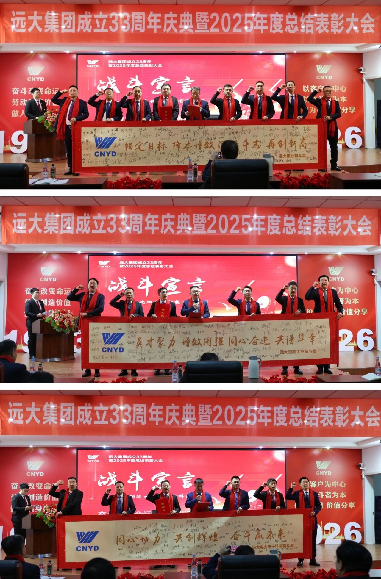伴着激昂旋律,铝业、电梯、电力电子高管团队及代表依次登台,整理队形、展示卷轴,以铿锵有力的声音领读2026年度战斗宣言,各产业参会人员齐声跟读,誓言响彻会场。三份宣言点燃激情,三条誓言凝聚力量,卷轴上的每一个签名都是向目标宣战的决心,每一句跟读都是向新征程冲锋的号角,彰显了远大人“召之即来、来之能战、战之必胜”的硬核实力。